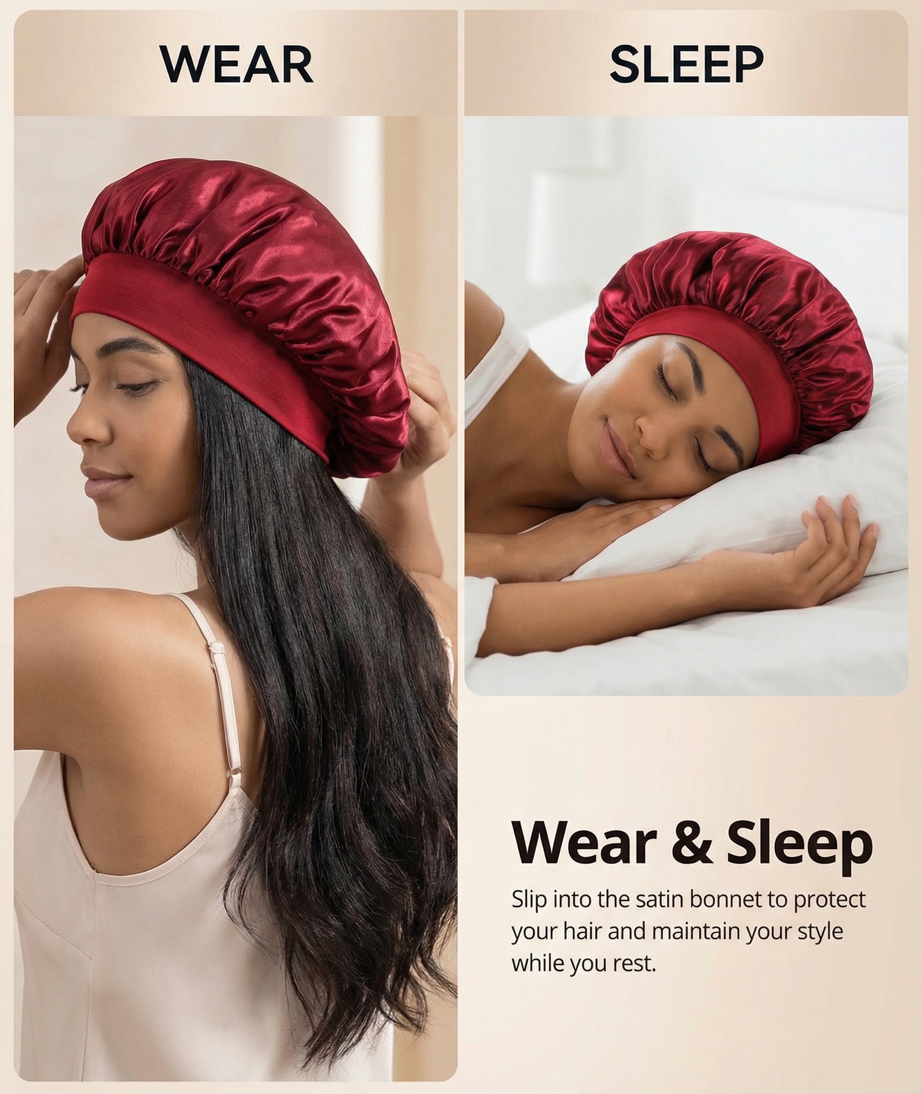 Overnight Hair Protection: Slip the satin cap over dry or lightly styled hair before bed. The smooth satin surface reduces friction between your hair and pillow, helping prevent tangles, split ends, and frizz while you sleep.
